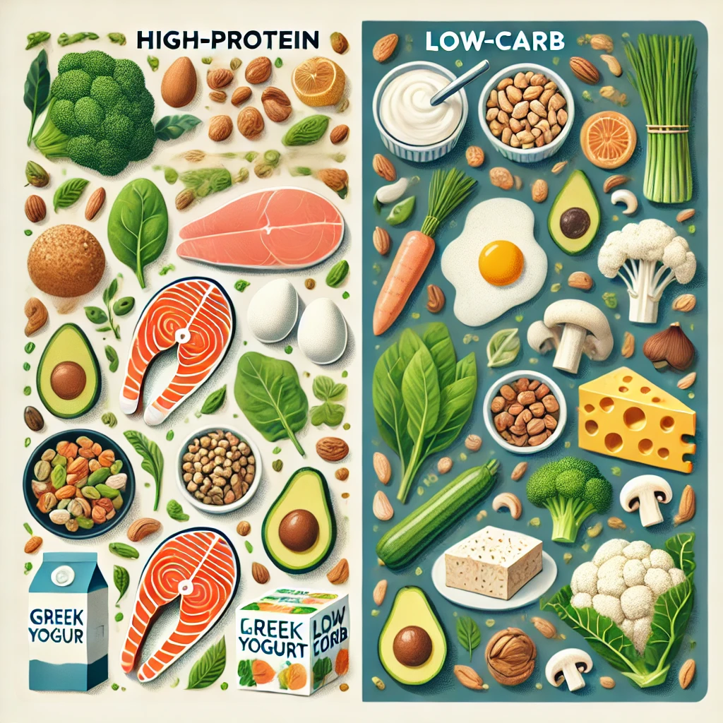 고단백 식품은 근육 형성과 신진대사를 촉진하는 반면, 저탄수화물 식품은 혈당 조절과 체중 감량에 효과적입니다.