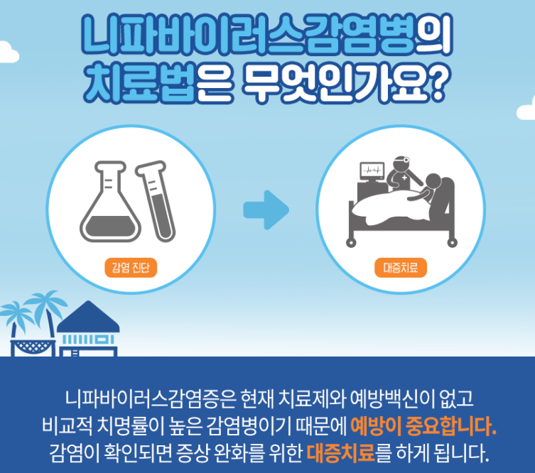 니파바이러스에 대한 정식 치료제도 아직 없습니다.