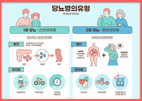 | 제2형 당뇨병 | 생활습관, 비만 중심 | 인슐린 저항성 중심, 식이·운동 중요 |