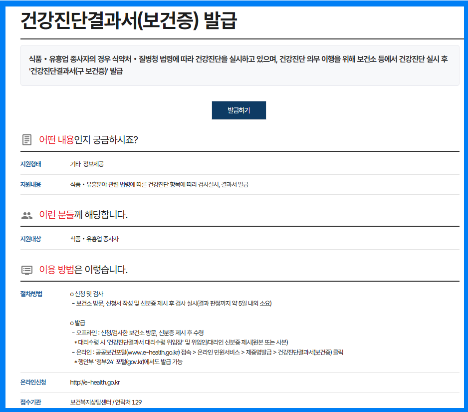 - 해외 제출용, 외국인 등록용 보건증은 반드시 현장 발급이 필요합니다.